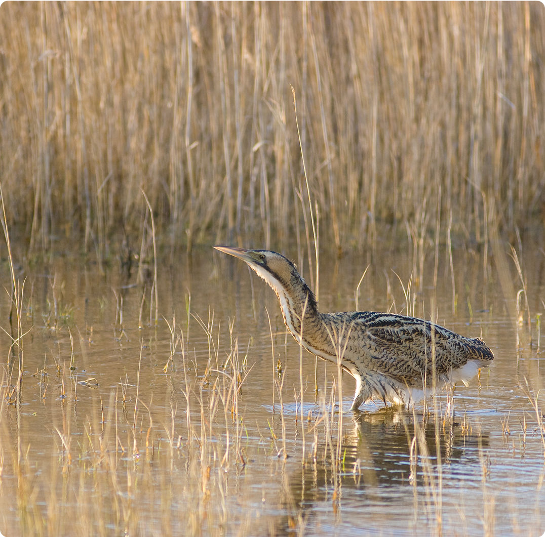 De février à juin pendant la saison de reproduction, les chants des mâles, au son proche des cornes de brume ou d’un mugissement de taureau, retentissent dans le marais. Ses “hum-bouh” peuvent porter jusqu’à 2 km. Tendez l’oreille !