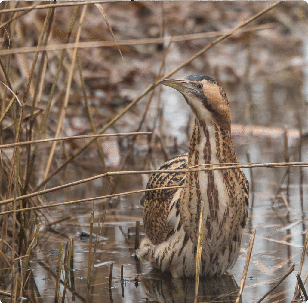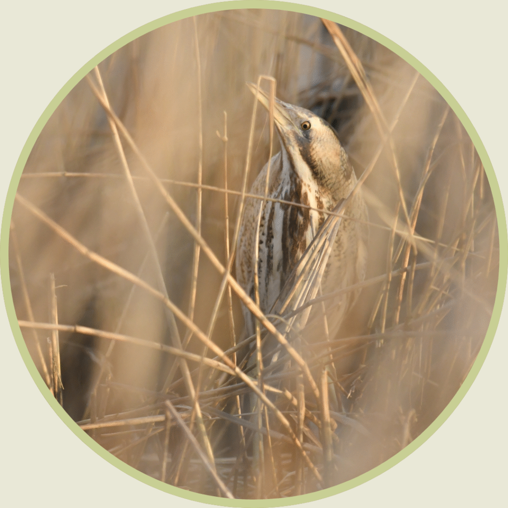 Cette espèce de héron au plumage brun doré constellé de noir - qui lui a donné son qualificatif d’étoilé - se confond parfaitement parmi les roseaux, notamment en cas de danger ! Il tend alors son cou et son bec vers le ciel et peut passer quasi-inaperçu.